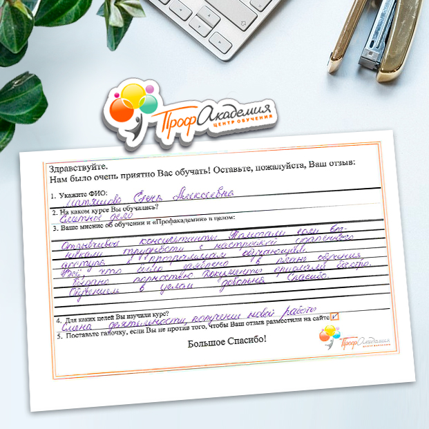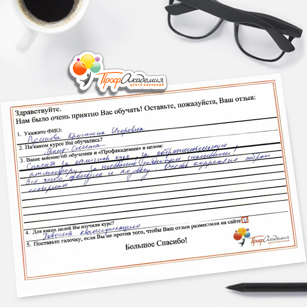 Спасибо за отличный курс, за доброжелательную атмосферу, за желание делиться знаниями! Все четко, полезно и по делу. Очень корректно собран материал.